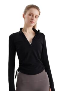 [MORGEN SKY] スポーツウェア ヨガウェア トップス レディース 長袖 シャツ ハイネック ハーフジップ 指穴付き サイドドロスト フィットネス トレーニング 春秋 おしゃれ ロングスリーブ プルオーバー CX082 (L, ブラック)