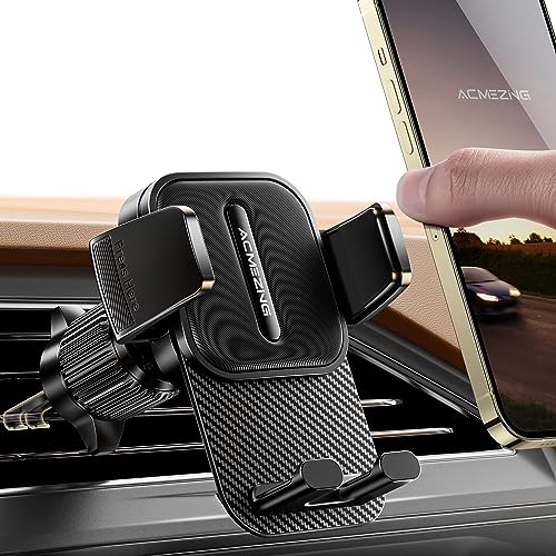 ACMEZING 車 スマホホルダーは、金属製二重フックと炭素繊維パネルを採用。エアコン吹き出し口に設置可能で、360度回転。4-7インチのiPhone/Android対応、安定性抜群で片手操作も簡単。