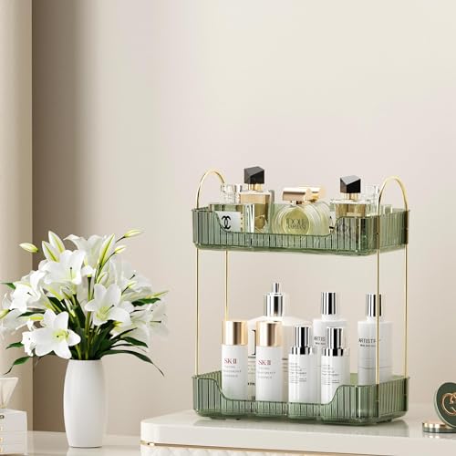 3段式バスルーム収納ラック。透明なグリーンの2層デザインで、化粧品やメイクアップ、ヘアドライヤーを効率よく整理。スタイリッシュで機能的な収納ソリューションに最適です。