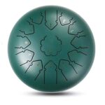 ハンドパンドラムは13ノートの12インチサイズで、優れたサウンドを持つタンドラムです。持ち運びに便利なキャリーバッグとドラムスティック付き。色はグリーンです。