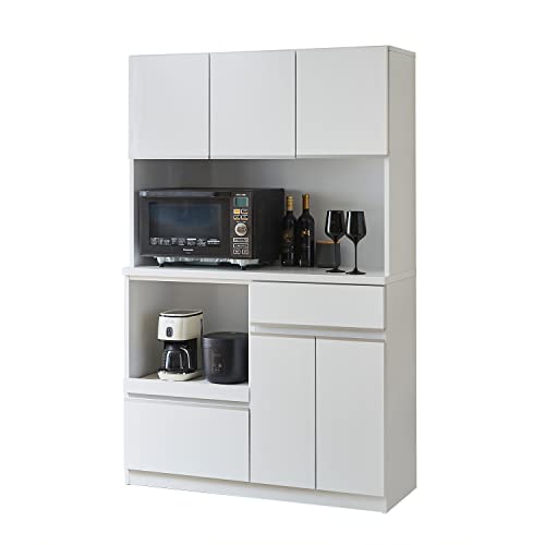 KAGUCOCOのナポリ食器棚・レンジ台は、幅120cmの鏡面ホワイト仕上げ。オプションフル加工セットで、コンセント付きの機能的なキッチン収納。おしゃれなデザインで、大川家具の品質が魅力です。