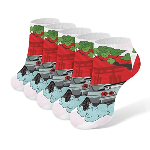 AE86のくるぶし靴下5足セット。スポーツソックスでショート丈、メッシュ仕様による通気性が特徴。脱げにくく、通勤・カジュアル・ビジネスに対応し、全ての季節に適用。