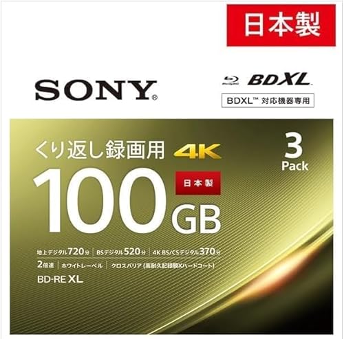 日本製のブルーレイディスク、繰り返し録画用100GB、3枚パックです。高品質でデータの保存や録画に最適。多様な用途に対応し、安心して使用できます。