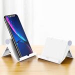 折りたたみ式のポータブルタブレットスタンド。電子書籍リーダーや携帯電話、タブレットに対応。コンパクトで持ち運びに便利なブラックのデザインです。
