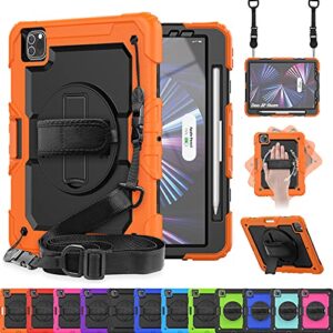「内蔵スクリーンプロテクター」Doo iPad Pro 11 ケース iPad Pro ショルダーケース 11インチ第4/3/2/1世代対応 耐衝撃 カバー ペン収納付き Pencil2対応 360°回転キックスタンド 手持ちバンド ショルダー 落下防止 三層構造 防塵 防滴 頑丈 子供 現場用 iPad Pro 11インチタブレットPCケース(オレンジ+ブラック)
