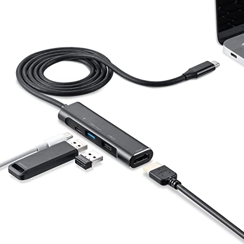 サンワダイレクトのUSBハブは、Type-C接続でHDMI 4K出力、USB-C×1(PD対応)、USB-A×2を搭載。アルミ製でセルフパワーとバスパワーの両方に対応。ケーブル長1m。