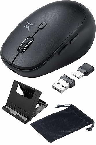サンワダイレクトのワイヤレスマウスは充電式で静音、Type-CおよびType-A対応。5つのボタン(戻る/進む搭載)、dpi切替可能。スマホスタンドとポーチ付き、モデル番号は400-MAWC173BKです。