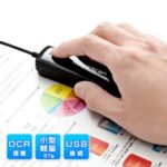 サンワダイレクトのハンディスキャナ(400-SCN009BK)は、OCR搭載のポータブルスキャナ。名刺や文書をUSB接続で簡単スキャン可能。コンパクトなブラックデザインで持ち運びにも便利。