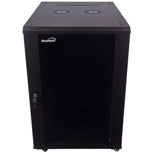 NavePoint 18U ウォールマウントサーバーキャビネットは、24インチの深さでガラスドアとロック付き。キャスターも付いており、移動が簡単です。