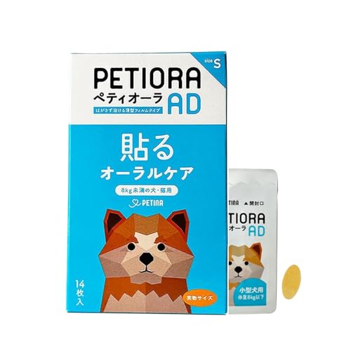 ペティオーラ AD Sサイズは、8kg未満の犬や猫用のオーラルケア製品です。14枚入りで、貼るだけで口臭をケアし、簡単に使用できます。溶けてなくなるので、後処理も不要で便利です。