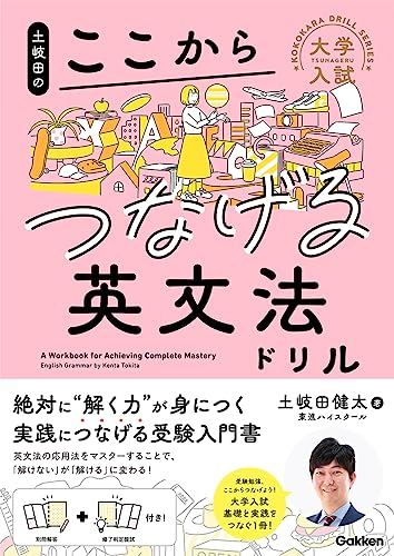 土岐田のここからつなげる英文法ドリルは、大学入試対策に特化した英文法の問題集です。分野別に整理された問題を通じて、効率的に文法を学ぶことができます。実践的な演習を重視し、理解を深める内容となっています。