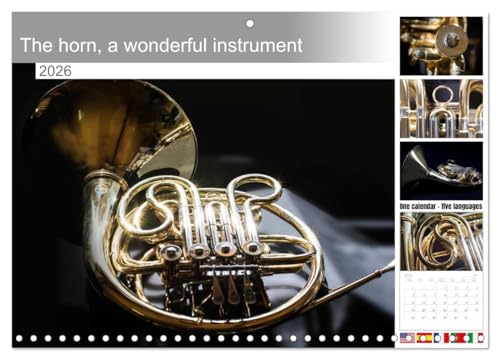 ホーンをテーマにした2026年の月間壁掛けカレンダー。サイズは16.5インチ x 23.5インチ(オープン)で、14ヶ月分の素晴らしいアートが楽しめます。