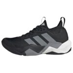 アディダスのトレーニングシューズ、ラピッドムーブ ADV 2 NKP54 レディース。カラーはコアブラック/グレー/グレーで、サイズは23.5 cmです。軽量で動きやすく、クッション性に優れたデザイン。
