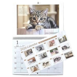 2026年 かわいい猫 壁掛けカレンダー, 月間表示,B4サイズ (36.5×25.5cm), 日本製 祝日標記付き メモ欄付き 12ヶ月