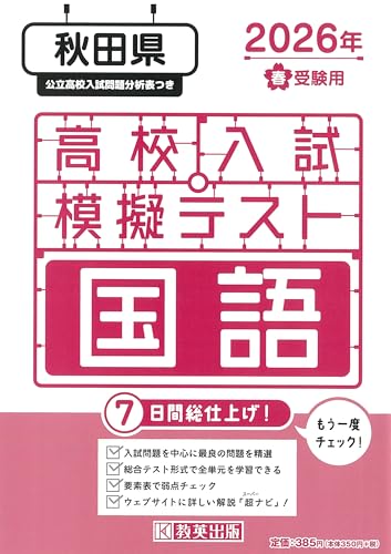 2026年春受験用の秋田県高校入試模擬テスト国語。出題傾向を反映した問題集。効率的な対策が可能で、解説付きで理解を深める。出題範囲の言語知識や文学作品の分析力を強化。