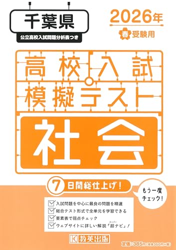 千葉県2026年春受験用の高校入試模擬テスト社会では、最新の出題傾向に基づいた問題を収録。理解を深めるための解説付きで、苦手分野の克服に最適です。計画的な学習をサポートする充実した内容です。