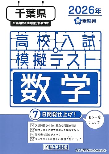 2026年春受験向け千葉県高校入試模擬テスト数学。実践的問題集で傾向分析、解説付き。過去問も収録し、効率的な学習をサポート。目標校合格に向けた必携アイテムです。