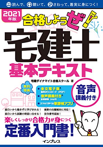 2021年版の『合格しようぜ! 宅建士 基本テキスト音声講義付き』は、重要ポイントをまとめたテキストと、単語帳アプリがセットになっています。音声講義で学習効果を高め、宅建士試験合格をサポートします。