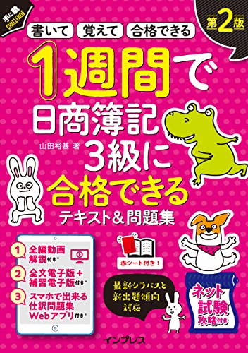 『1週間で日商簿記3級に合格できるテキスト&問題集 第2版』は、合格に必要な知識を短期間で習得できる内容です。PDF資料や動画解説、模試も付属し、効率的な学習をサポートします。