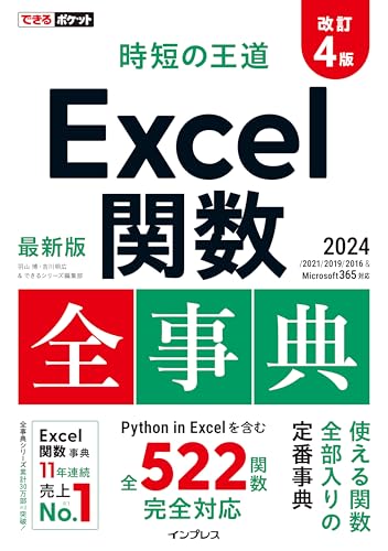 『できるポケット 時短の王道 Excel関数全事典 改訂4版』は、Excel 2024/2021/2019/2016 & Microsoft 365に対応。関数の使い方が他書より分かりやすく、特典として例ファイルDLも可能です。