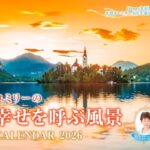 購入者限定特典付きの2026年カレンダー「幸せを呼ぶ風景」。月めくりタイプで、サイズは600mm×380mm。年間カレンダー入り幸運カード封入。