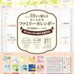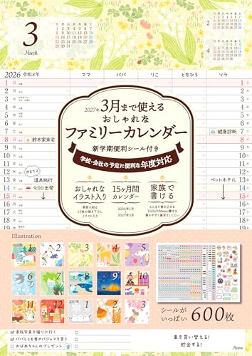 2026年版のおしゃれなファミリーカレンダーは、3月まで使え、新学期便利シールも付属。月めくりの壁掛けタイプでサイズは420mm×297mm。特典付きで便利です。