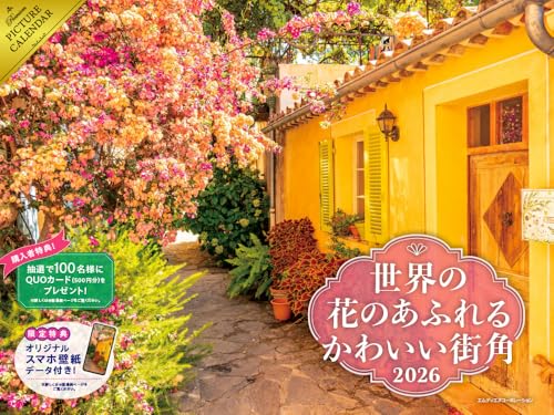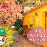 2026年版の「世界の花のあふれるかわいい街角カレンダー」。花咲くヨーロッパの風景を月ごとに楽しめます。購入者限定特典として、スマホ壁紙データ2種付き(壁掛けタイプ/大判)。