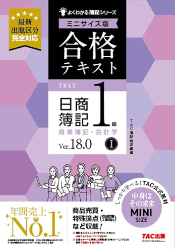 合格テキスト 日商簿記1級 商業簿記・会計学Ⅰ Ver.18.0 ミニサイズ版は、商品売買や特殊論点(収益確認、工事契約など)を網羅した教材です。TAC出版が提供するよくわかる簿記シリーズの一環で、試験対策に最適です。