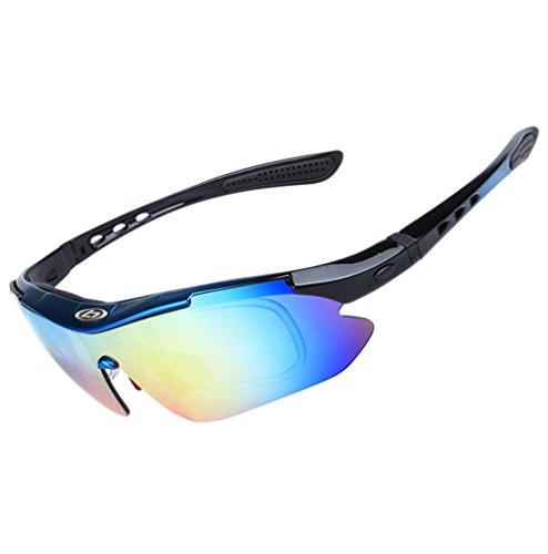 Wonzoneの偏光UV保護サングラスは男女兼用で、スポーツやアウトドア活動に最適。交換可能なレンズ5個付き。デザインはクールで、色はブルー&ブラックです。