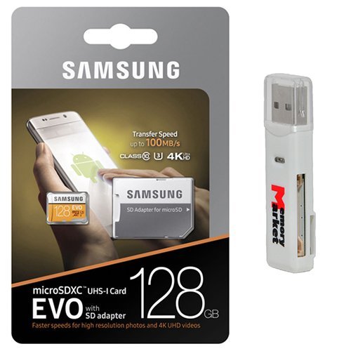 Samsungの128GB microSD XCクラス10カードは、最大100MB/sの読み取り速度を持ち、MicroSD to SDアダプタ付き。USB 2.0メモリカードリーダーで便利。