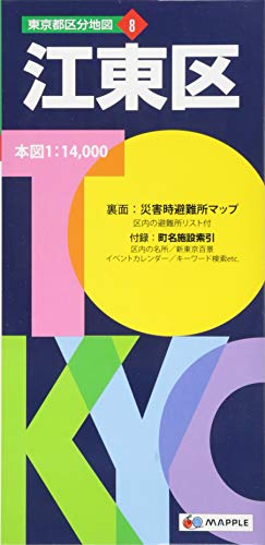 東京都の江東区を詳細に示す区分地図です。地形や施設情報が豊富で、観光スポットや交通機関も確認できます。移動や散策に便利な情報が詰まった一冊。