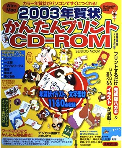 2003年賀状かんたんプリントCD-ROMは、年賀状用のイラストや文字素材を1180点収録しており、初心者でも簡単にオリジナル年賀状を作成できます。SEIBIDO MOOKから発売されています。