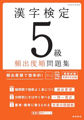 最新試験傾向に対応した漢字検定5級の問題集です。頻出漢字を基にした問題が収録されており、効率的に学習できます。解説も充実しているため、理解を深めながら準備ができます。