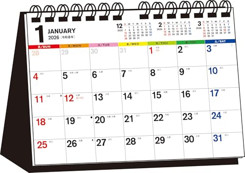 2026年シンプル卓上カレンダー(カラー/A5ヨコ)は、永岡書店製で、使いやすいデザインが特徴。シンプルなレイアウトで、日付やイベントが見やすく、デスク周りをスッキリまとめます。