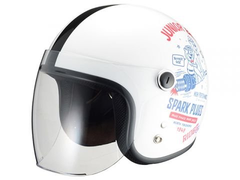 RIDEZ Jr SPARK PLUGS ジェットヘルメットは、ホワイト/ブルーのデザインで、53-54cmのキッズ向けバイクヘルメットです。開閉シールド付きで安全性と快適さを提供します。