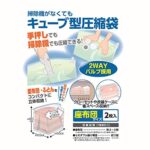 日本クリンテックの掃除機不要なキューブ型圧縮袋。座布団サイズ2枚入り、幅130cm、奥行90cm、マチ部65cm。ふとん圧縮袋としても使用可能で、手押し掃除機対応。収納や引越しに便利です。