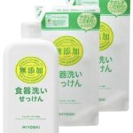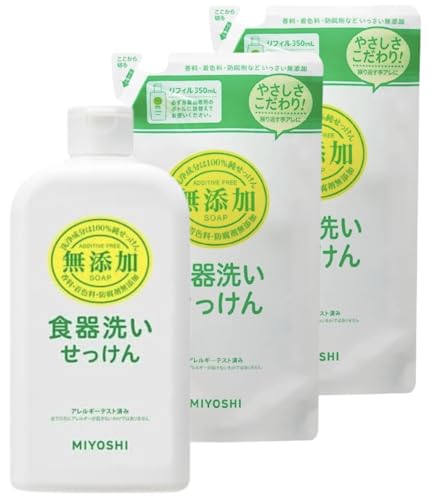 ミヨシ石鹸の無添加食器洗いせっけん370mlと350mlの詰め替え2個セットです。無添加で安心、安全に食器を洗えます。ショップオリジナルのおまけ付きでお得感があります。