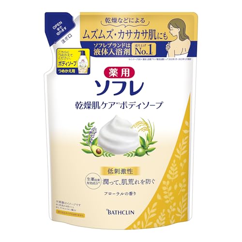 薬用ソフレ ボディソープは、乾燥肌ケアに特化した医薬部外品です。フローラルの香りが心地よく、肌を優しく洗い上げながら潤いを保ちます。つめかえ用400mlで使いやすさも抜群です。