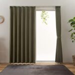 ユニベールのドレープカーテンは、幅200㎝×丈230㎝の1枚タイプで、遮光3級を実現。形状記憶機能を持ち、洗濯も可能なグリーンのデザインです。