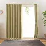 ユニベールのドレープカーテンは、2級遮光、燃えにくい防炎加工、形状記憶機能を持ち、幅100cm×丈240cmの2枚組です。洗濯可能で、グリーンのステイシーデザインがおしゃれです。