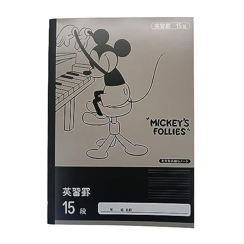 カインズのディズニー学習帳、ミッキーマウスデザインの英習罫15段ノートです。糸綴じ仕様で、学校や学童用品に最適。英語学習を楽しくサポートします。