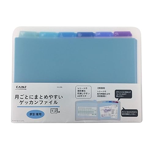 カインズのゲッカンファイルは、家計簿用のA5Eサイズで、12ポケットを備えています。月ごとにまとめやすく、サイズは幅230mm、高さ170mm。デザインはブルーで、収納力に優れた実用的なアイテムです。