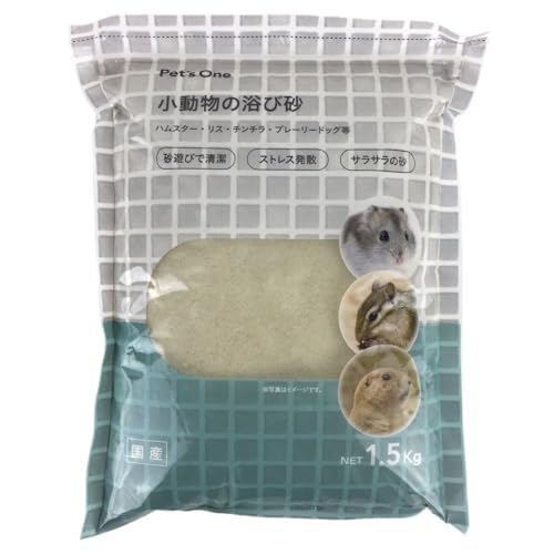カインズのPet’sOne小動物の浴び砂は、1.5kgの国産砂で、チャック付きの袋に入っています。サラサラの質感で、ハムスターやリス、チンチラ、プレーリードッグのストレス発散に最適です。