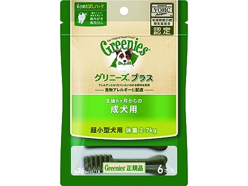 グリニーズ プラス 成犬用超小型犬用は、体重2-7kgの犬向けの歯みがきガムです。6本入りで、歯垢や歯石の除去を助ける設計。おいしい味で愛犬が喜んで噛んで、口腔ケアができます。