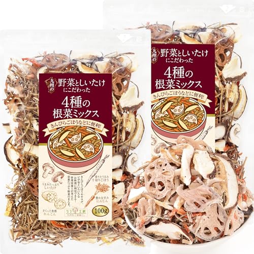 管理栄養士監修のリフ工房の国産乾燥野菜、4種の根菜ミックス100g×2袋セット。九州産のれんこん、千切りごぼう、人参、原木しいたけ使用。保存食に最適で、残留農薬検査済み。
