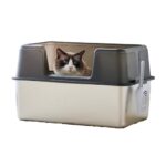 ステンキャットトイレ L ハイタイプは、幅60cm×奥40cm×高35.5cmのサイズで、クリアブラックのステンレス製。清潔感があり、シンプルで丈夫なデザイン。飛び散り防止機能付きで、猫のトイレタイムを快適にサポートします。