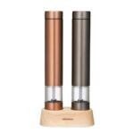 シービージャパンの電動ペッパーミルはカッパーとグラファイトグレーの2本セット。専用ウッドスタンド付きで、岩塩や胡椒などのスパイスを粗さ調節可能で使用できます。