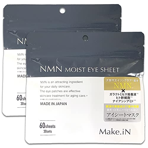 エヌエムエヌのモイストアイシートは、60枚入(30セット)で日本製。保湿成分ガラクトミセス、ヒト幹細胞、ナイアシンアミドを配合し、目元のケアに最適なスキンケアアイテムです。