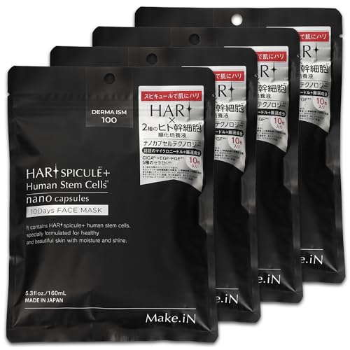 Make.iN HARI スピキュール + ヒト幹細胞フェイスマスクは、保湿成分セラミド、CICA、EGF、FGFを配合。10日間の集中ケアで、しっとり肌を実現。4袋(10枚入×4)で、スキンケアを手軽に楽しめます。