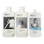 ecostoreのトライアルキットには、ユーカリのランドリーリキッド、シトラスのファブリックソフナー、無香料のディッシュウォッシュリキッドが含まれています。全て植物由来で肌に優しい製品です。
